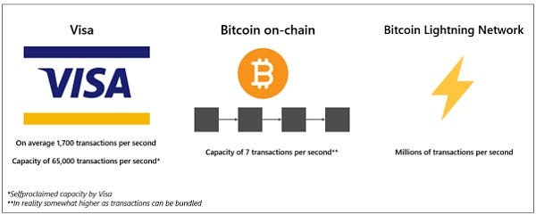 The lightning network allows for instant payments with millions of transactions per second and extremely low fees. This makes Bitcoin both faster, cheaper and far more energy-efficient than the legacy fiat system.