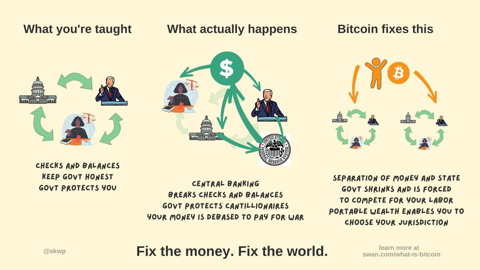Bitcoin separates money and state, which is about as significant as the separation of church and state was in the past, if not more. A transparent, immutable and incorruptible monetary network/policy solves all corruption the fiat system (and all other crypto projects) naturally attracts.